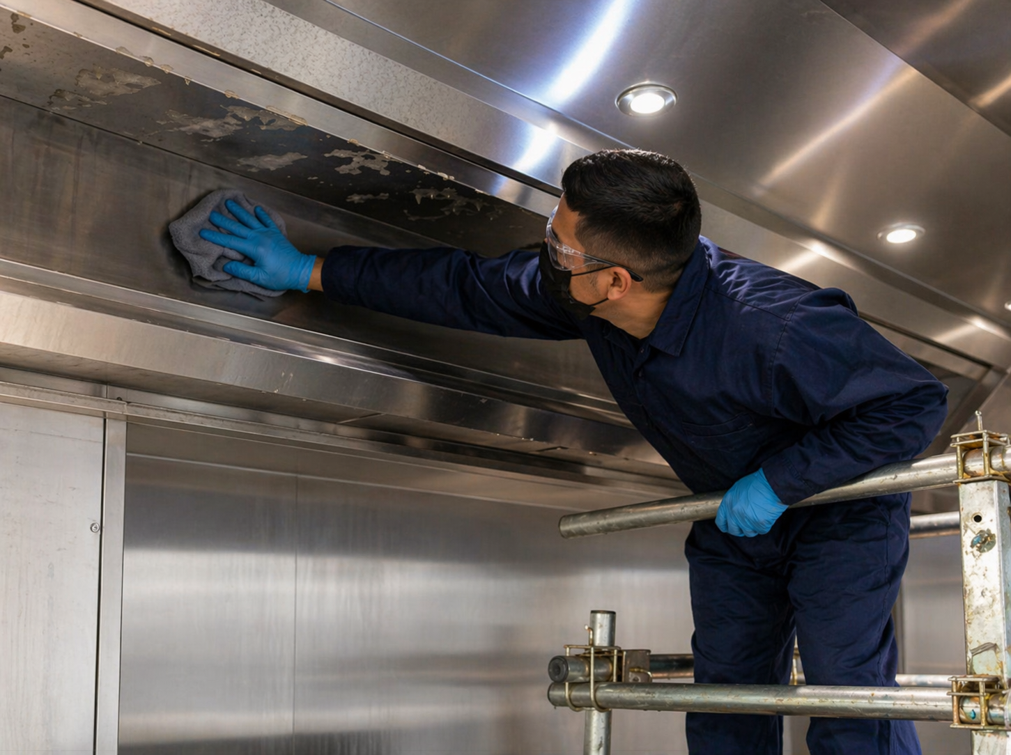 Full manual grease removal from hood, plenum, duct, and fan — with careful containment protecting dining-room finishes, carpet, and fixtures.