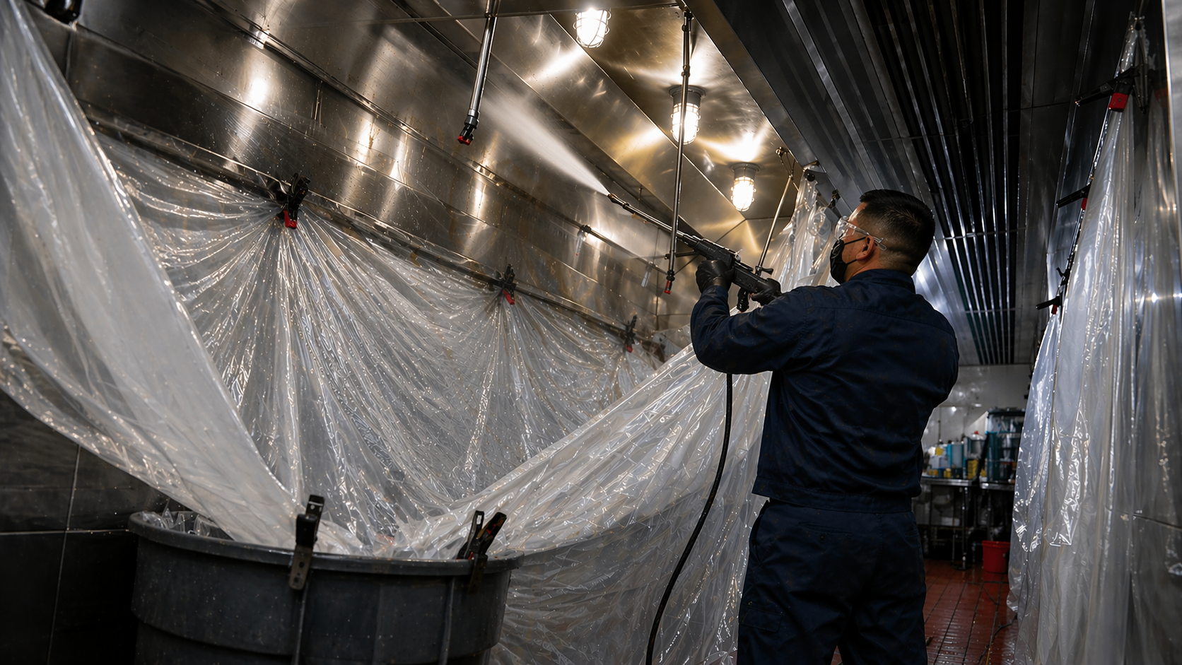 Full manual grease removal from hood, plenum, duct, and fan — with barriers, HEPA containment, and negative-pressure measures where the ICRA calls for them.